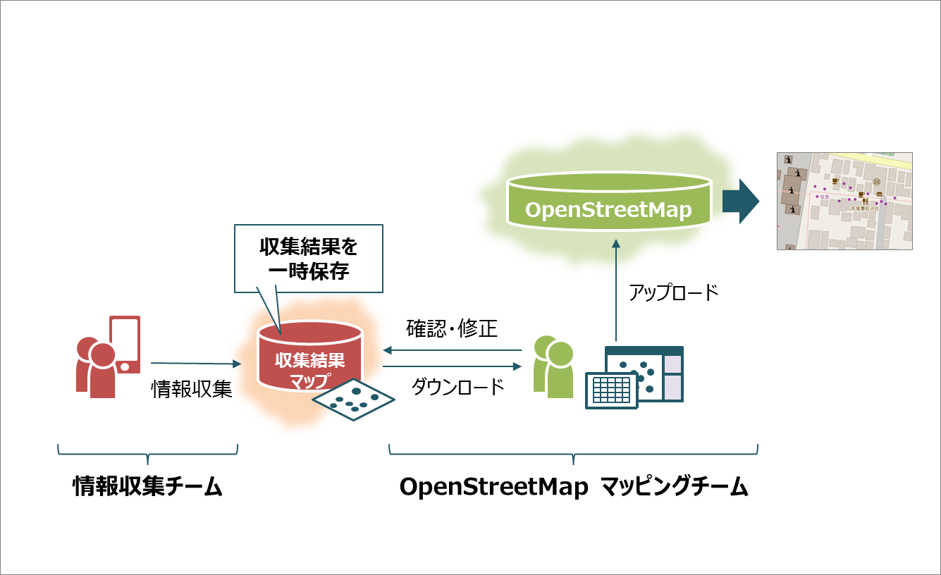 まず、マッピング参加者は情報収集ツールを使用して、マッピング対象地域を歩きながらマッピングに必要な情報を収集します。ここで作られたデータは OpenStreetMap の本データベースに蓄積されるのではなく、別のクラウド上に一時保存されています。次に、現地調査の後、データに重複がないか、入力ミスがないかを確認・編集ツール上で確認し、必要に応じて修正作業を加えます。最後に、修正を済ませたデータを OpenStreetMap の習熟者がまとめて OpenStreetMap の本データ上にアップロードし、一連の作業は完了です。